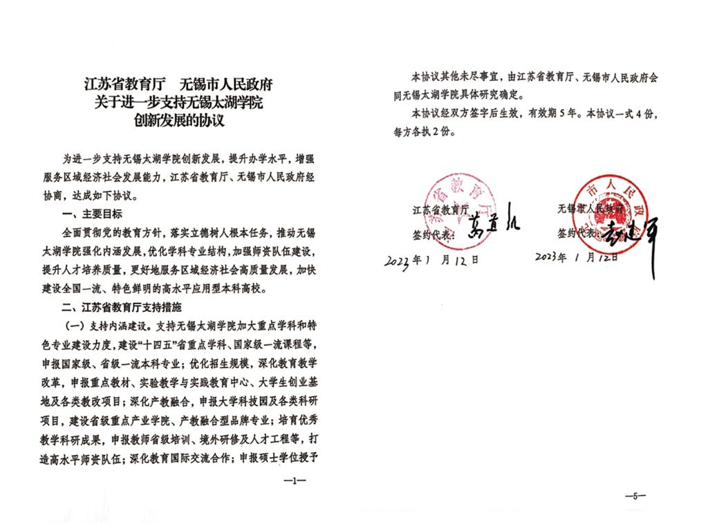 江苏省教育厅、无锡市人民政府共同签署《关于加大支持beat365正版唯一官网创新发展的协议》
