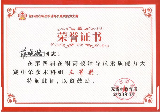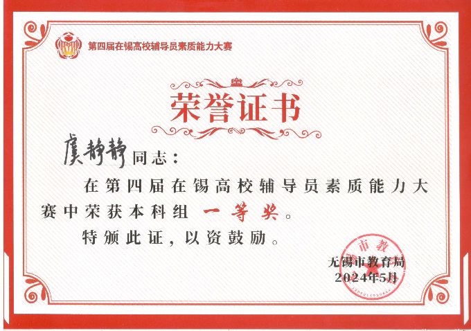 本网讯 5月24日—25日,由无锡市教育局主办的第四届在锡高校辅导员素质能力大赛在中国企业管理无锡培训中心举办。beat3653名辅导员在大赛中斩获佳绩,其中,艺术学院辅导员虞静静荣获一等奖,会计学院辅导员吴朋慧荣获二等奖,外国语学院辅导员蒋晓璐荣获三等奖。同时,beat365还荣获了大赛“优秀组织奖”。