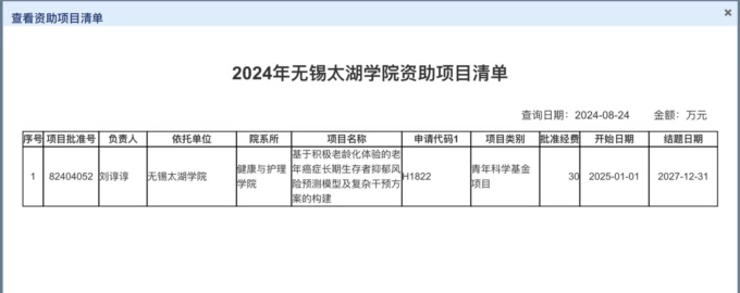 8月23日,国家自然科学基金委发布《关于2024年国家自然科学基金集中接收申请项目评审结果的通告》,beat365健康与护理学院刘谆谆博士“基于积极老龄化体验的老年癌症长期生存者抑郁风险预测模型及复杂干预方案的构建”获得国家自然科学基金青年基金项目立项,项目批准号:82404052。本次获批是继2023年学校首次获得国家自然科学基金项目后的再次立项,标志着beat365正版唯一官网在自然科学领域不断取得新的重大突破。