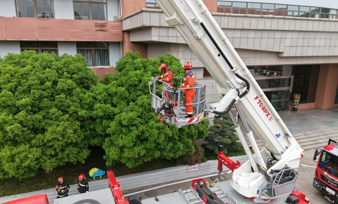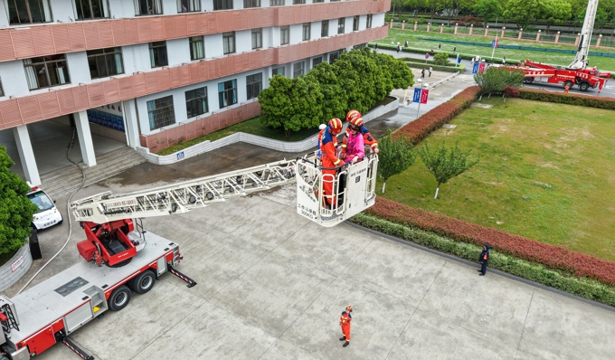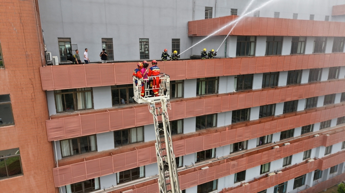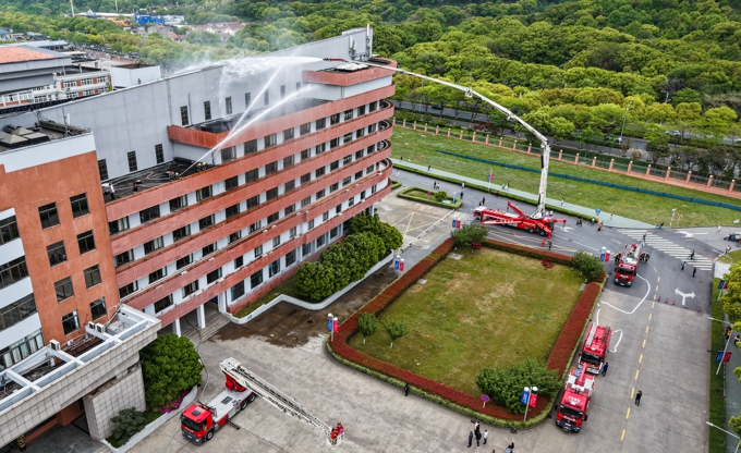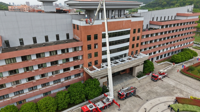当日下午,随着无锡市消防救援支队作战训练处处长冯剑秋宣布演练正式开始,学校六号教学楼内模拟发生火灾事故。确认火情后,保卫处人员迅速摁下消防一键警报,启动应急广播。在急促的警铃声中,师生在工作人员带领下,按照“安全第一、就近逃生”的疏散原则,俯身、弯腰、用毛巾等捂住口鼻,贴着墙脚,保持着安全距离,沿着指定的路线快速疏散,仅用了1分57秒,近千名师生全部迅速有序撤离至指定区域。随后,消防救援人员利用无人机精准侦察火情、确定着火点位,并迅速果断使用压缩泡沫消防车、登高平台消防车等设备解救被困人员,同时,消防人员利用多节臂高喷车、消防指挥车、无人消防坦克等多类专业设施向同学们全面展示了火情压制、精准扑灭、高空救援等场景。当消防车缓缓举臂,将登高平台升至7楼救出“被困”的2名同学时,现场爆发出雷鸣般掌声,为全体消防指战员们饱满的工作热情、高超的灭火技能和专业的救助手段齐声喝彩。
