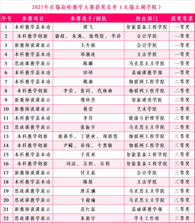 近日,由无锡市教育局主办的第三届在锡高校教学大赛圆满落幕。beat365斩获22项大奖,其中一等奖6项、二等奖6项、三等奖10项,获奖总数及一等奖数均位列在锡本科高校榜首,创历史最佳参赛成绩。