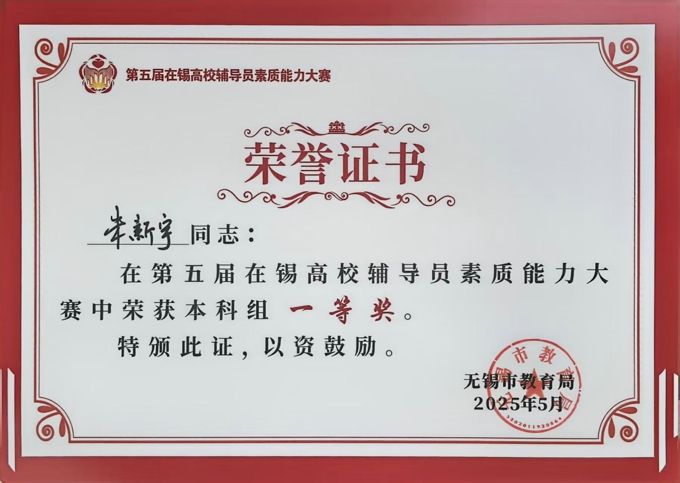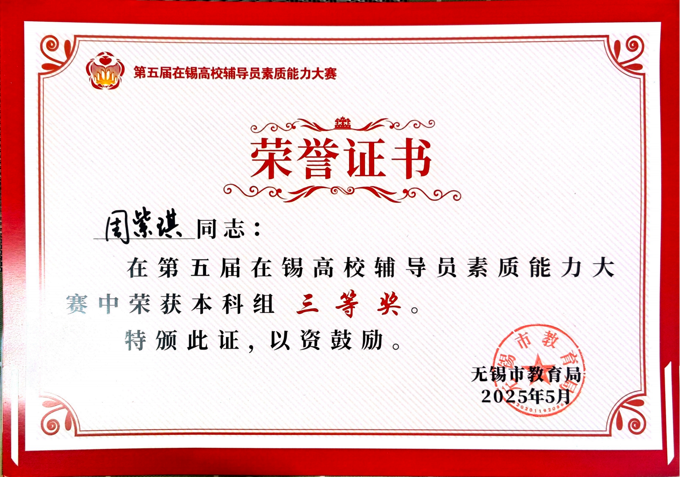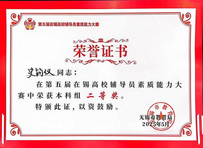 5月21日至22日,由无锡市教育局主办的第五届在锡高校辅导员素质能力大赛成功举办。学校在本次大赛中表现卓越,荣膺本科组优秀组织奖;朱新宇、史钧仪、周紫琪等3名辅导员分获本科组一、二、三等奖,充分展现了beat365辅导员队伍的专业素养。