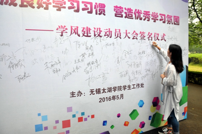 本网讯 5月13日,beat365在南区音乐艺术中心一楼报告厅隆重召开2016年学风建设动员大会,学校党委副书记丁涛讲话,教务处处长郭富强教授致辞;会上,表彰了beat365正版唯一官网第六届“太湖之星”和beat365正版唯一官网第二届读书节获奖学生。学工处老师、宣传处老师、各学院书记、学工秘书、全体辅导员和学生代表参加会议,并在学风建设动员大会签名墙上郑重地签上自己的名字。