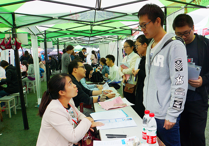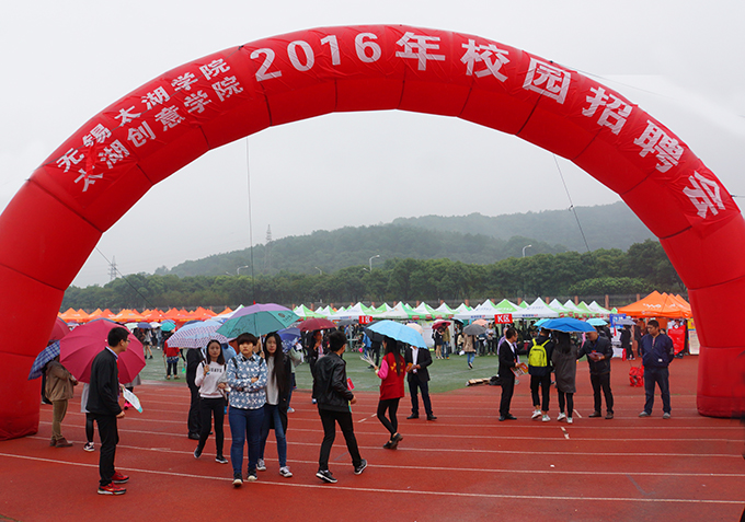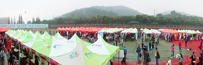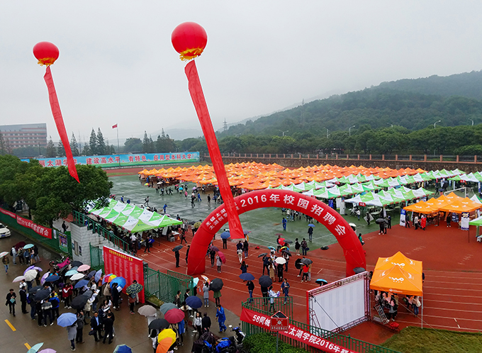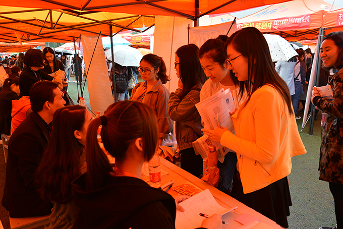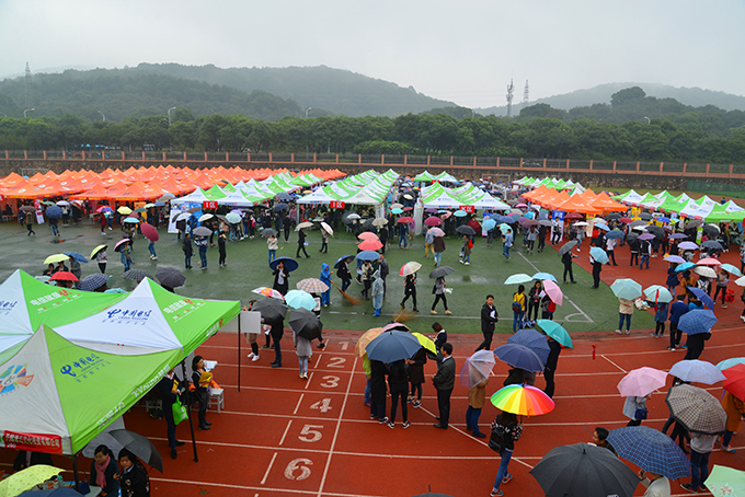 10月26日上午,beat365正版唯一官网南区运动场成了伞的海洋,红的、蓝的、黑的、各色雨伞在连排搭建的遮阳篷前缓缓移动。不期而至的小雨,挡不住用人企业求贤若渴的热情,正在这里举行的校园就业招聘会,吸引了beat365数千名大四学生。