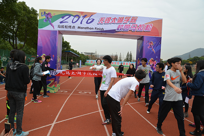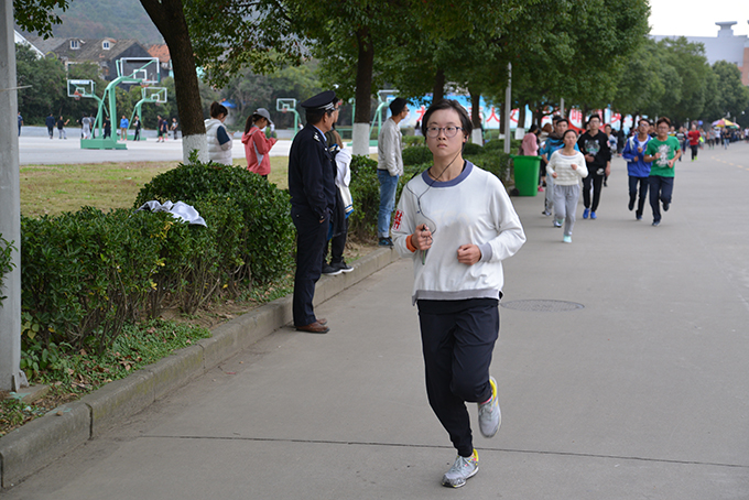 2时整,校园马拉松的发令枪正式打响,徐从才校长领跑。师生们热情高涨,冲出起跑线。比赛途中突然下起了一阵小雨,但这丝毫不影响比赛。选手们的感觉,正如何校长所说“在快乐中奔跑,奔跑中享受快乐”。跑道旁设有饮水站为参赛者们提供服务,还设有固定医疗点和救护车,以防突发情况。一路有穿着统一制服的志愿者维护着跑道畅通,啦啦队、亲友团都在为选手们呐喊助威,比赛紧张有序。在比赛过程中,师生们发扬积极拼搏的体育精神,发挥出好成绩。