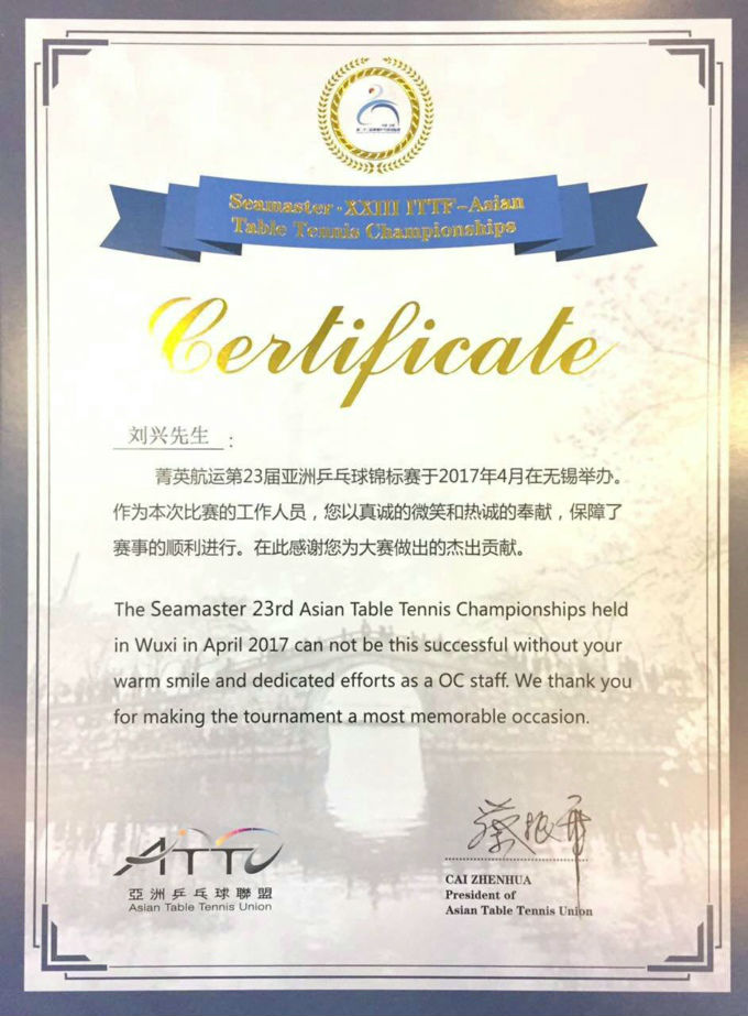 蔡振华签名颁发的荣誉证书上,有这样一段话:刘兴先生,第23届亚洲乒兵球锦标赛于2017年4月在无锡举办,您以真诚的微笑和热诚的奉献,保障了赛事的顺利进行,在此感谢您为大赛做出的杰出贡献。刘老师笑道:“我不是一个人在战斗,而是一个团队。所以,这不仅是对我个人的肯定,也是对太湖学院师生的褒奖。”