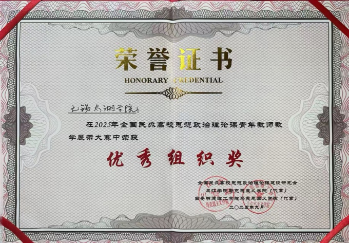 近年来,学校马克思主义学院始终将教师队伍建设作为提升办学质量的核心抓手,通过定期开展教学竞赛、技能培训、教研交流等活动,为青年教师搭建成长平台,激发青年教师教学热情与创新活力。学校马克思主义学院将以此次获奖为新的起点,进一步持续关注青年教师发展,持续优化思政课教师队伍,提高思政课教学改革和创新水平,为学校高质量发展贡献力量。(供稿:马克思主义学院)