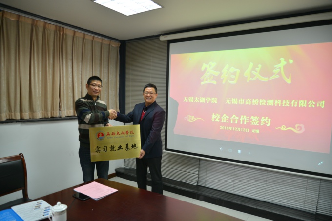 12月13日上午,土木工程学院与无锡高桥检测科技有限公司校企合作签约仪式在在高桥检测科技公司会议室举行,学校党委副书记丁涛与公司董事长高亚伟、总经理杨传国签署了合作协议,土木工程学院院长章星、学校教务处、招就处等部门人员参加了签约仪式。