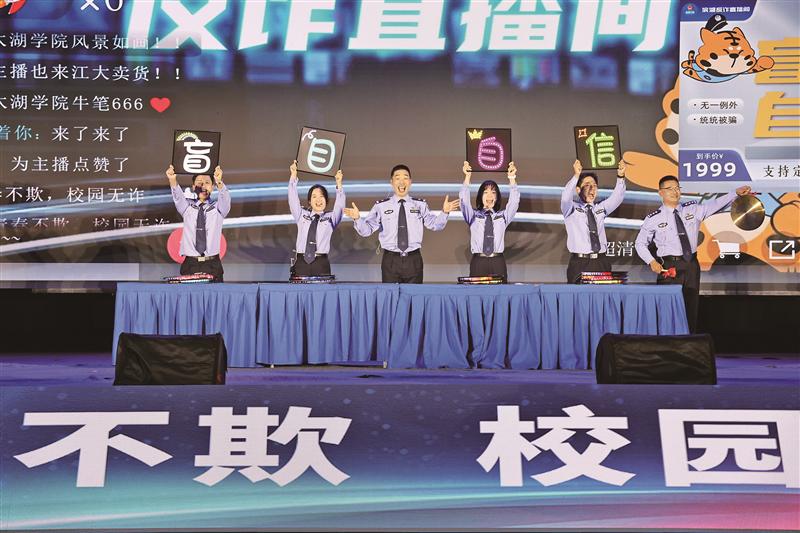 “欢迎各位同学来到滨湖公安反诈直播间!” “粗心大意、盲目自信、爱贪便宜、诈骗工具人,这些‘产品’大家下单了吗?”活动现场,滨湖公安金牌反诈宣讲员“直播”带货,反诈天团卖力介绍“产品”。“去年凡是购买一号链接的,无一例外,统统被骗,你们心动不心动?”“最后一单‘高薪兼职’诈骗工具人,要不要?”“帮信罪一口价,三年以下有期徒刑,‘刑不刑’?”现场气氛十分热烈,同学们却直呼“不敢买”。