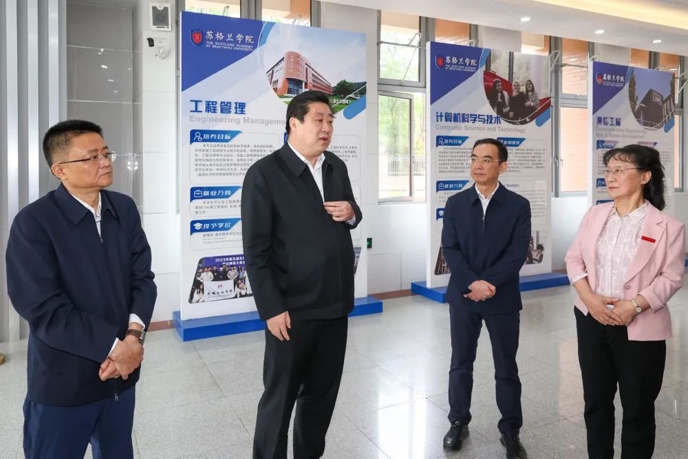 在太湖学院,赵建军实地走访学校与韩国特西氪公司共建的第三代半导体融合实验室,详细询问校企合作模式、人才联合培养等情况,鼓励学院立足应用型民营高校优势特点,注重投入产出效率,不断完善直通产线的校企协同育人机制,加强与无锡科研机构、龙头企业的务实合作,围绕半导体装备、零部件和耗材的国产化进程开展科技攻关,努力打造集成电路领域的人才实训基地和技术溢出平台。走进学校的中英合作办学机构——苏格兰学院,赵建军深入了解专业设置、教学特色、升学就业等情况,希望学院进一步整合国内外优质教育资源,培养更多适应时代需求的高水平国际化人才。