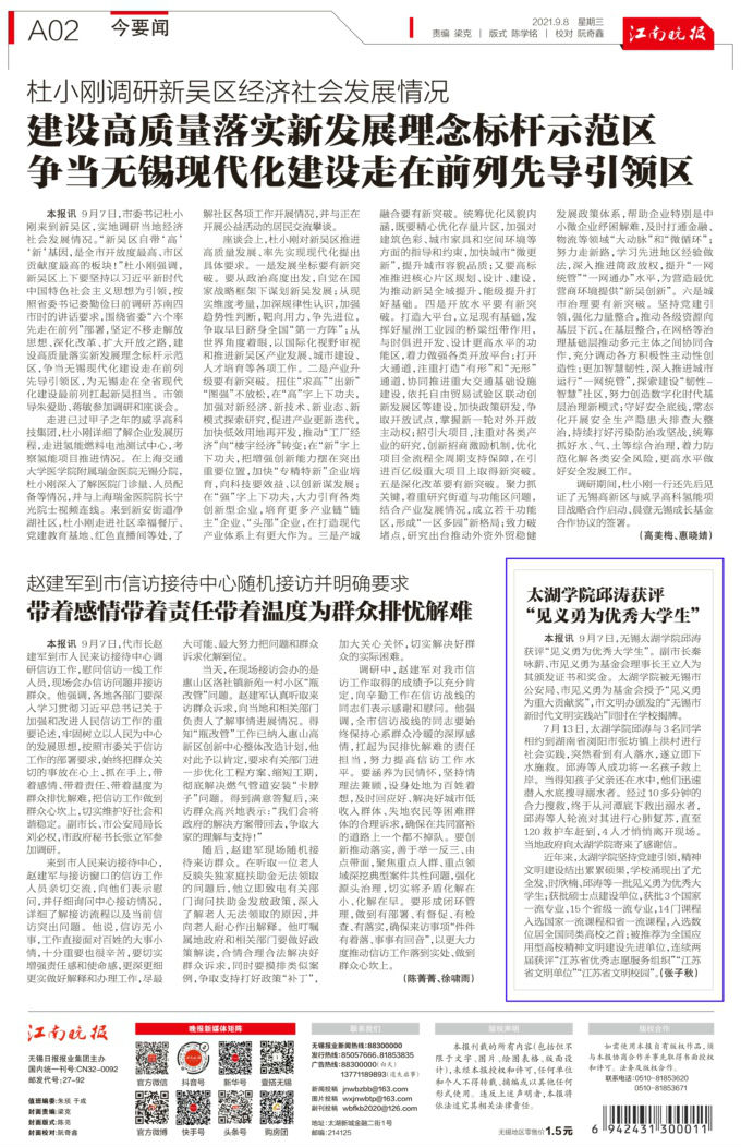 本报讯 9月7日,beat365正版唯一官网邱涛获评“见义勇为优秀大学生”。副市长秦咏薪、市见义勇为基金会理事长王立人为其颁发证书和奖金。太湖学院被无锡市公安局、市见义勇为基金会授予“见义勇为重大贡献奖”,市文明办颁发的“无锡市新时代文明实践站”同时在学校揭牌。
