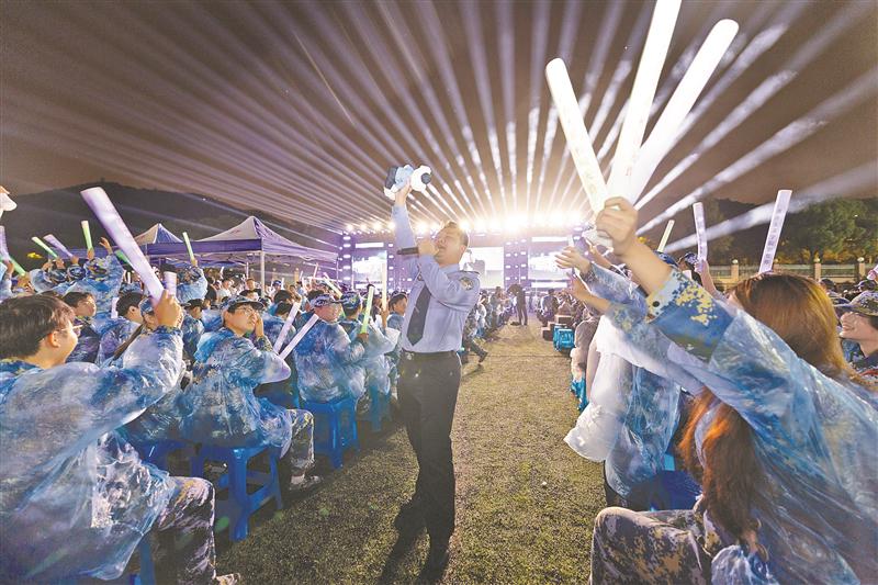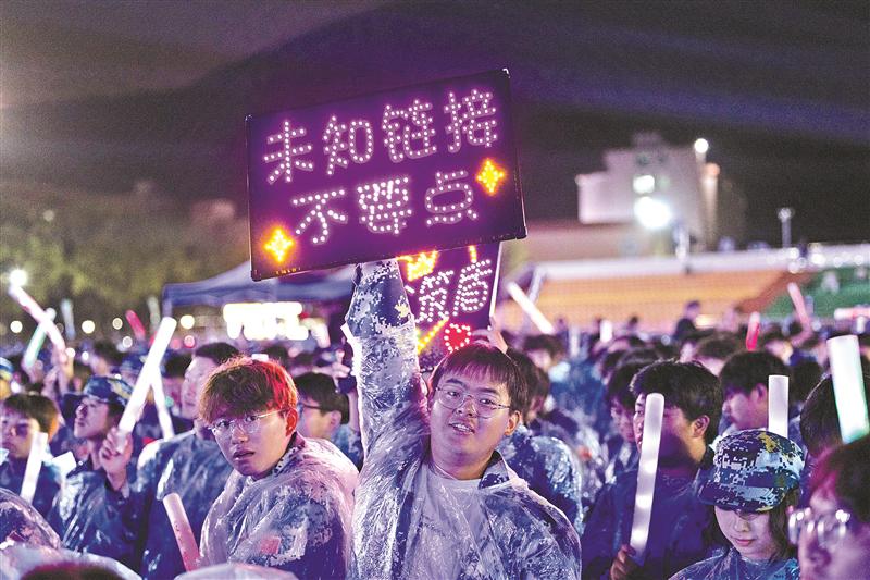 ▶现场嗨不停,宣讲员走进学生中间,一声声反诈口号将现场气氛推向高潮。 (岳高翔 摄)