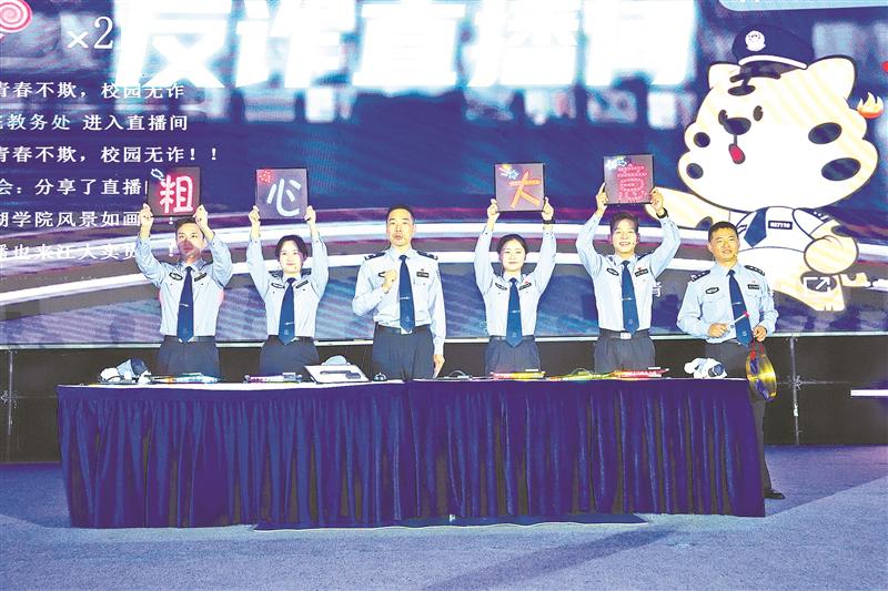 ▲反诈讲不停,有料又有趣!滨湖公安“反诈天团”围绕校园易发生诈骗类型,通过“反诈直播间”的形式和师生互动连连。(刘译允 摄)