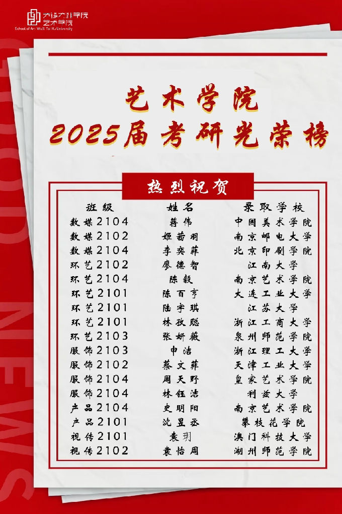 星光不负赶路人,愿上岸学子在新征程中继续以艺为帆,乘风破浪;也希望更多同学以他们为榜样,坚定信念,勇敢追梦!未来,艺术学院将继续与每一位学子并肩前行,书写更多辉煌!