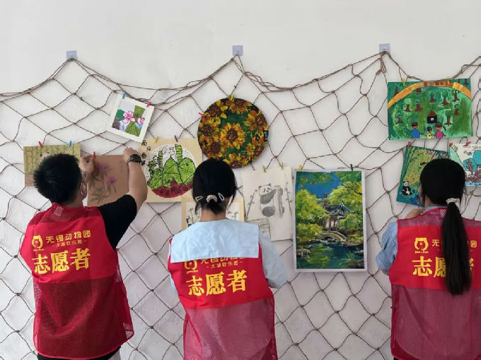 在非洲部落展区,以“维护生物多样性”为主题进行布展,YI行志愿者们分工明确,志愿者率先把网绳拉起,将画作错落有致地悬挂,在动物园工作人员的协助下,志愿者们将学生们的画作挂在网绳上面,为动物园增添了一道亮丽的风景线,使得游客深刻感受生物多样性的魅力。