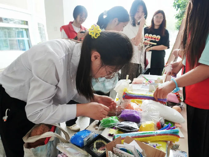活动现场,YI行志愿者特别设立创意补给站,提供瓶盖、轻黏土、扭扭棒等手作工具。同学们通过艺术思维与实践能力的有机融合,将废弃材料转化为兼具功能性与观赏性的再生作品——从扭扭棒的编织到黏土的塑造,每件作品都诠释着循环再生的美学价值。