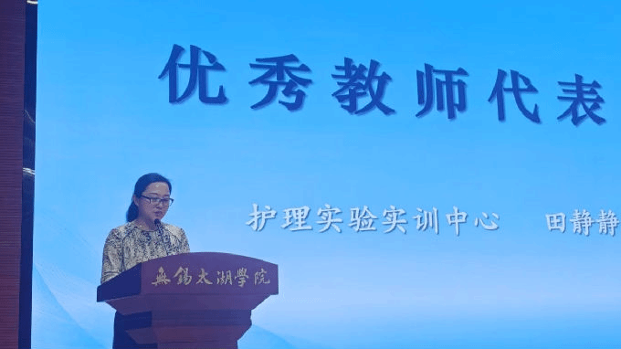 教师表彰环节中,田静静等4位教师被授予“学生灵魂工程师”称号。教师代表田静静分享教学心得。田老师分享教学心得时强调,“护理教育不仅是技能的传授,更是职业品格的塑造。我们培养的是‘有温度的医者’,需在临床中锤炼技能,在实践中淬炼仁心。”