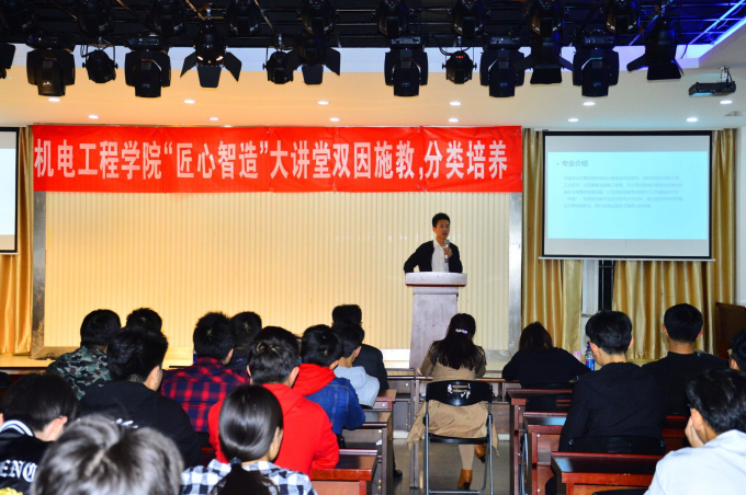 2018年4月17日晚六点半,机电工程学院第二期“匠心智造”大讲堂--双因试教、分类培养讲座于南区大学生活动中心举行。本次讲座有幸邀请到海天教育集团无锡分校校长陈跃老师。出席本次讲座的有机电工程学院工科实验室主任姜斯平教授、吴景春老师、刘洁老师以及百余名学生代表。