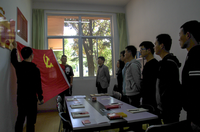 宣誓仪式在雄壮的《国际歌》声中开始。新党员入党宣誓由学生党支部书记许心怡领誓,三位新党员在党旗前表达了他们对党的庄严承诺。现场老党员同志也庄严地举起右手再一次重温了入党誓言。