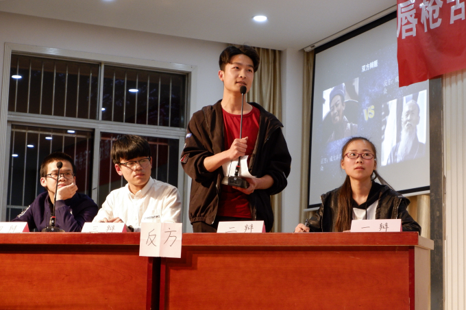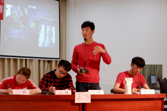 正方机械二班代表队所持观点为“成大事者不谋于众”,反方机电一班代表队则持“成大事者需谋于众”的观点。在台下同学们的欢呼声中,双方辩手出场,开宗明义,第一环节双方陈词。首先是正方辩手,几句充满气势的话语亮出了他们的观点,直接引用了《商君列传八》中“至德者不和于俗,成大事者不谋于众”来立足自己的观点,随后对“不谋于众”进行了解释——“谋求特别重大的事情,不对普通人说;参与决策的数量并不等于质量;低层次的智慧累加并不能产生适合成大事的高远智慧”,并提出了成大事者不谋于众的两方面的原因。反方也不甘示弱,旁征博引地直接抛出“刘邦项羽成败的史实”辩论自己“成大事者需谋于众”的观点。