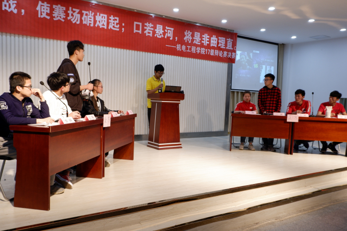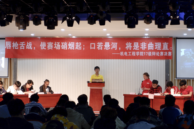 机电工程学院17级辩论总决赛于4月16日晚上6点40在大学生活动中心拉开帷幕,经过初赛的角逐,在众多队伍中脱颖而出的机械二班和机电一班在此一决高下。