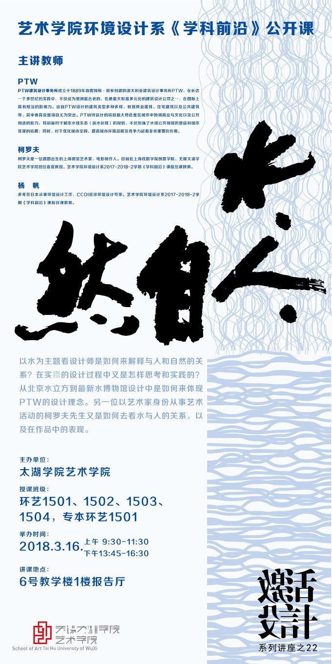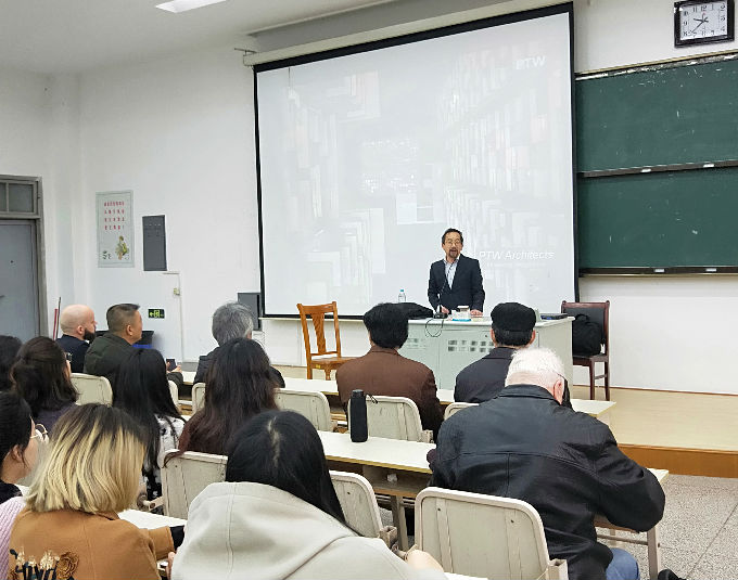 本网讯 艺术学院环境设计系专业教学活动《学科前沿》公开课暨艺术学院激活设计系列讲座第22期,秉承太湖学院不断创新的传统,秉持艺术学院搭建国际学术交流平台,引导艺术学院学生提升自身技能、培养自主创新能力的教学理念,让环境设计系全体师生打开新的视界,接触最前沿的艺术设计思想。活动主讲教师: PTW建筑事务所的执行董事Stephen Bai(澳大利亞、特邀讲座主讲人)与资深建筑师Kristian Momme Kristensen(丹麦)、柯罗夫(德国艺术家)、杨帆(CCDI环境设计专家兼主持人),满满的五个小时帮助同学们了解环境设计专业动态,未来能够在环境设计专业的职业道路上走得更加久远。艺术学院院长张锡,副院长朱宗明,孔德扬教授,环境设计系副主任王荻、徐盈婷副教授、陈兆倩老师、邓慧老师、闵鹤云老师参加现场教学活动,并聆听专家们的精彩讲演。