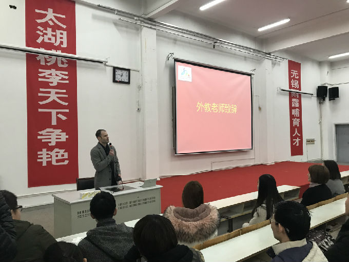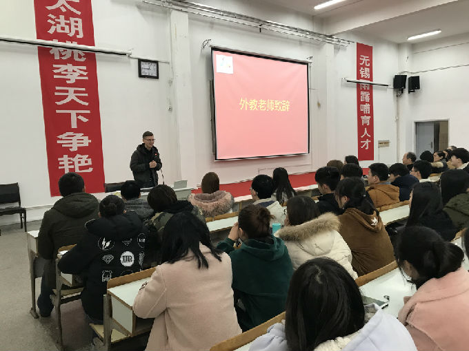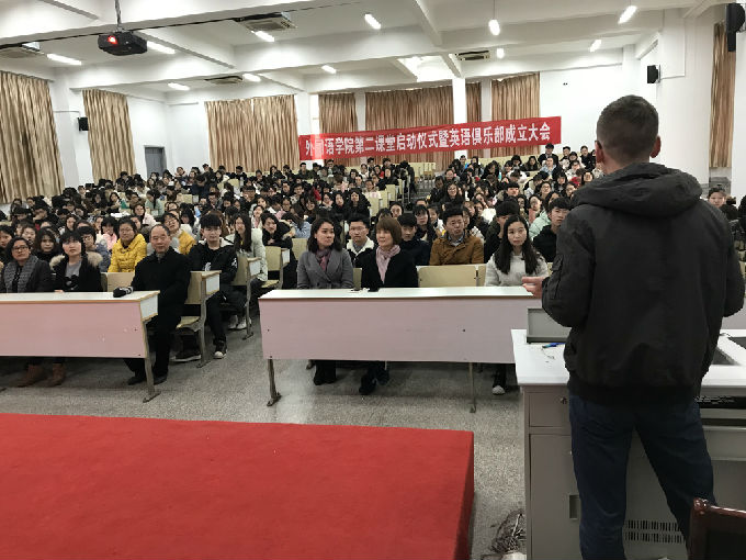 2018年3月21日中午12:30,外国语学院2015和2016级的英语和商务英语专业的全部同学齐聚在7-102教室里,参加外国语学院第二课堂启动仪式暨英语俱乐部成立大会,本次成立大会由外国语学院党总支、分团委与英语、商务英语、大学外语共同发起,并邀请学校国际教育学院四位外教老师担任主讲老师。参加此次成立大会的外国语学院党政领导有:外国语学院包通法院长、刘荔副院长、吴旻昊副院长,党总支副书记俞昊波。
