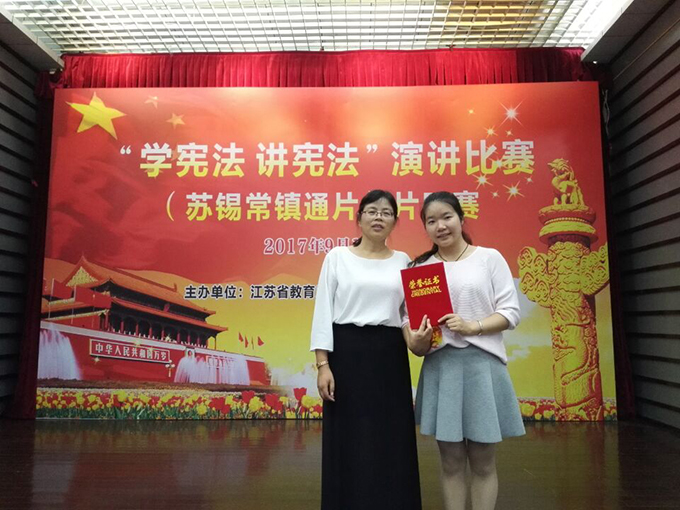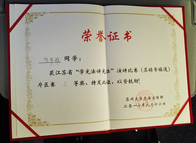 为全面贯彻党的十八大、十八届三中四中五中六中全会精神,深入学习贯彻习近平总书记系列重要讲话精神和治国理政新理念新思想新战略,落实“七五”普法规划、《青少年法治教育大纲》和《关于认真贯彻落实习近平总书记重要指示精神切实加强宪法学习宣传的通知》的要求,由苏州大学主办的“学宪法讲宪法”苏锡常镇通片区赛于9月16日举办,beat365外国语学院法学专业法学1502班贺梦雅同学在法学专业老师的鼓励下参赛,在苏锡常镇通的30名选手比赛中脱颖而出,获得江苏省“学宪法讲宪法”演讲比赛(苏锡常镇通片区)三等奖的好成绩。