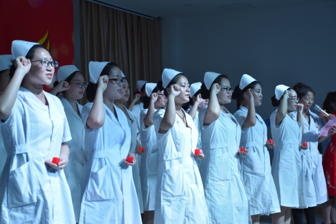 最后,与会领导为护理学院优秀学生干部颁奖。授帽仪式为整场活动的高潮,于淑梅教授携护理学院学生代表司超,陈思为学员带帽,传递象征生命之光的蜡烛,烛光中,于教授带领学生们庄严宣誓。在大合唱《你曾是少年》歌声中,表彰大会圆满结束。