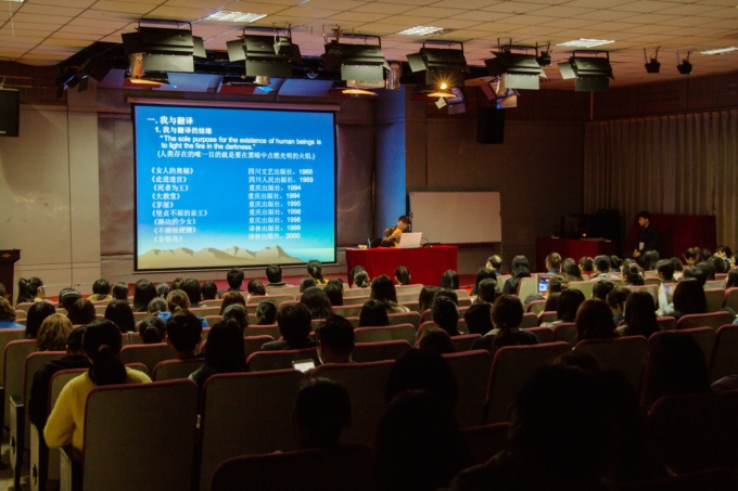 王宏教授曾参与37本汉译英、英译汉的文学著作,在外语类核心刊物发表论文48篇。讲座中他带领同学们走进了绚烂多彩的翻译世界。首先,王教授用诙谐幽默的语言讲述了他与翻译行业结缘以及从事翻译专业的种种经历,从汉译英翻译的实例向大家讲解了翻译中应注意的问题,呼吁大家积极投身到中国典籍英译的事业中来。接着,他引用了朱文振教授、余光中教授、斯果等名人大家对于翻译的不同看法,提出自己对翻译的认识。他认为,翻译看似语言的转换,其实是译字,也是译意,更是译味,这是两种思维方式和文化的转换。关于翻译教研,王教授用自己对翻译研究新思考的基础上,通过引用大量例证、进行强有力的对比,阐释了原文与译文的关系。他指出,对于翻译的研究和教学,要了解当代西方翻译文化研究的观点,要认识“文化转向”对翻译研究正反两面的影响。