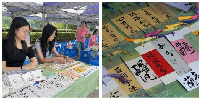 为热烈欢迎2025级新生,宣传中华优秀传统文化,艺术学院兰亭书画协会于9月11日在六号楼前开展2025级迎新活动。本次活动通过丰富的艺术体验和互动交流,为新生们开启了一扇通往书画艺术世界的大门。