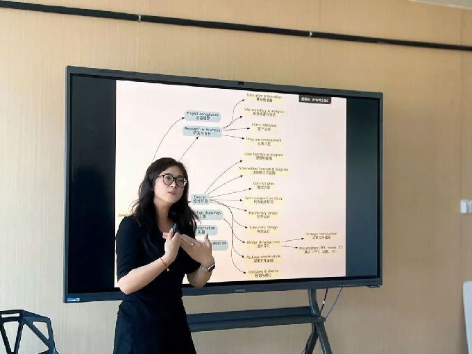 全德艳老师试讲的是大三的课程“艺术设计专业外语”。她以环境艺术设计为语境,将语言教学与专业实践紧密结合,让学生在真实设计情境中理解专业英语的表达与应用。课堂上,她善于通过项目案例分析和跨文化交流情境实践,让语言真正成为设计思维的一部分,旨在培养学生的综合职业素养,同时彰显了她国际化的教学视野。