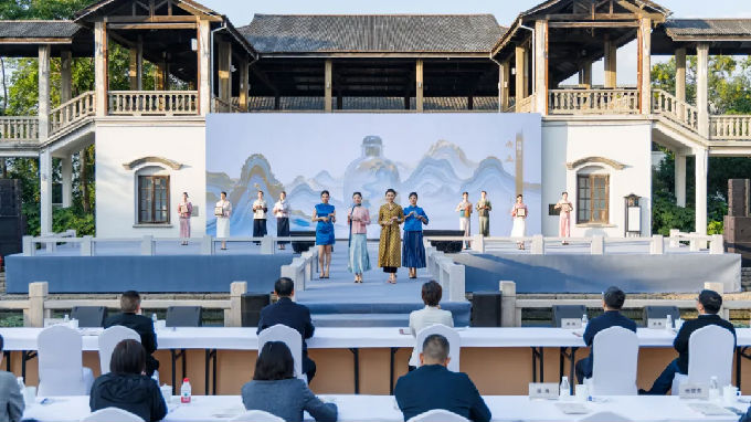 在本次活动中,RONG品牌的服装系列与无锡非遗器物共同呈现了一场别开生面的走秀。品牌从江南水韵、人文文化中汲取灵感,将传统工艺与现代服装设计相融合,展现出非遗在当代生活中的创新表达。
