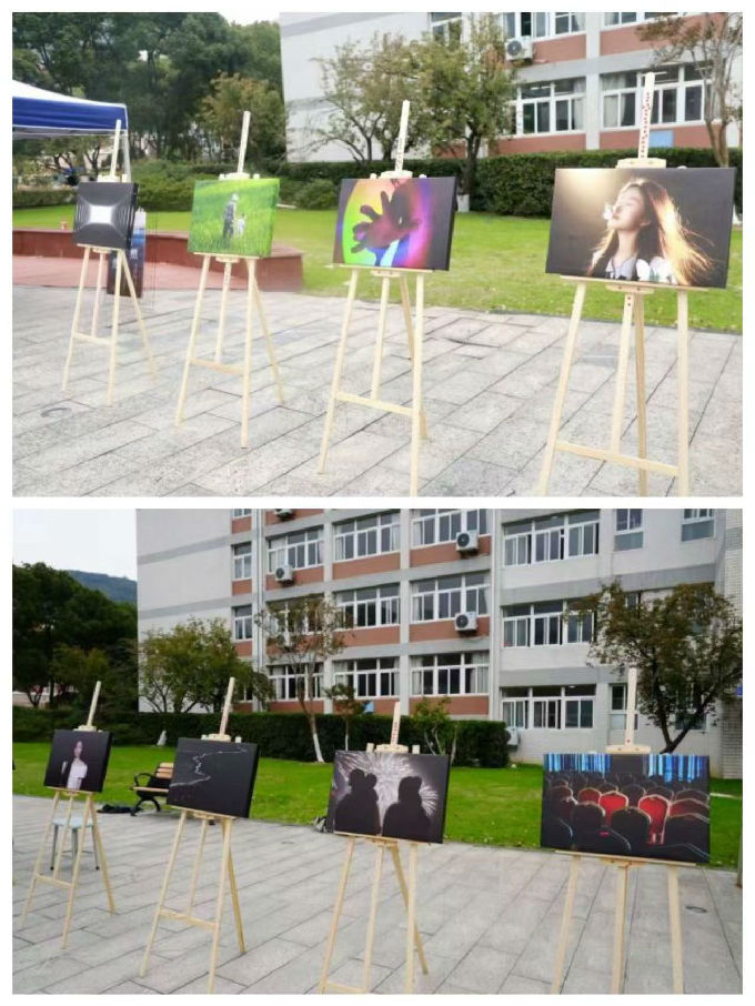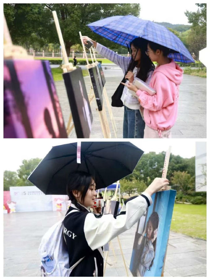 细雨微凉的校园广场上,十余架画架依次排开,镜头定格的志愿瞬间、光影晕染的故事,在画布上凝成具象的温暖——有的画是“绿野间的祖孙影,把烟火温情揉进春风里”,有的画是“霓虹中舒展的手,让抽象浪漫撞进眼眸里”,有的画是“光晕里轻扬的发,将青春明媚浸在柔光里”……每一幅画都藏着独一份的诗意和心意,即便雨丝轻落,仍有学子撑伞驻足,指尖划过画框时,目光里盛着共鸣的温度。