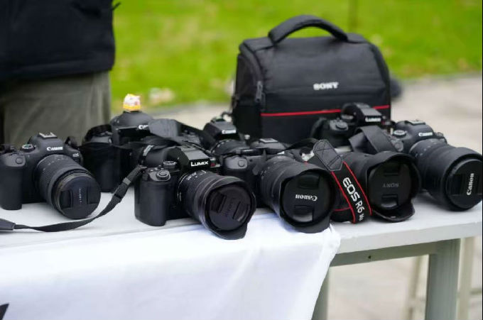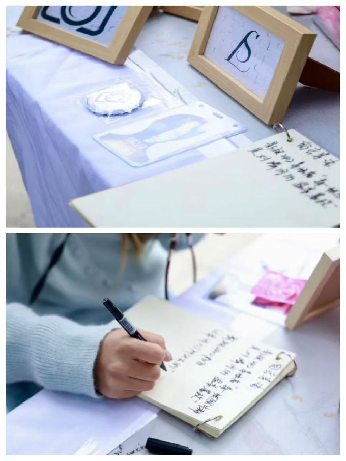 展区中央的蓝色帐篷下,相机与镜头错落陈列,这些曾记录过无数志愿时刻的“眼睛”,此刻成了展品本身;一旁的木框拼图里,相机图标与艺术符号相映成趣,仿佛在诉说“以艺为媒,以志为桥”的初心。桌前,有同学执笔在本子上写下句句真切的语句,字迹晕开的墨痕,恰似心底漾开的暖意。