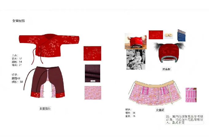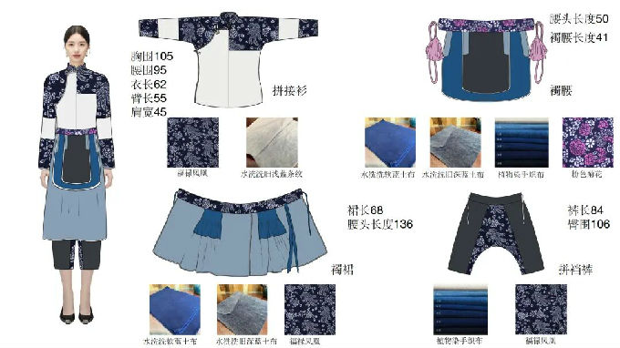 复原工作从史料梳理到视觉呈现,团队以近代甪直地区服饰为核心, 完成了效果图绘制,款式图拆解,实体款式复原的工作。还原了服饰的色彩搭配与穿戴场景,尽显江南水乡的温婉灵动。