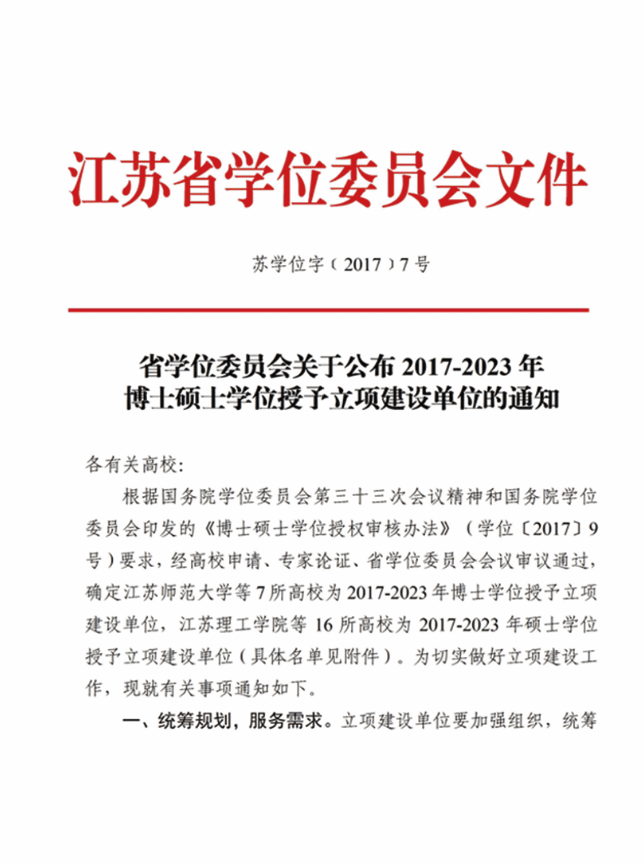 2017年,学校成为江苏省硕士学位授予立项建设单位