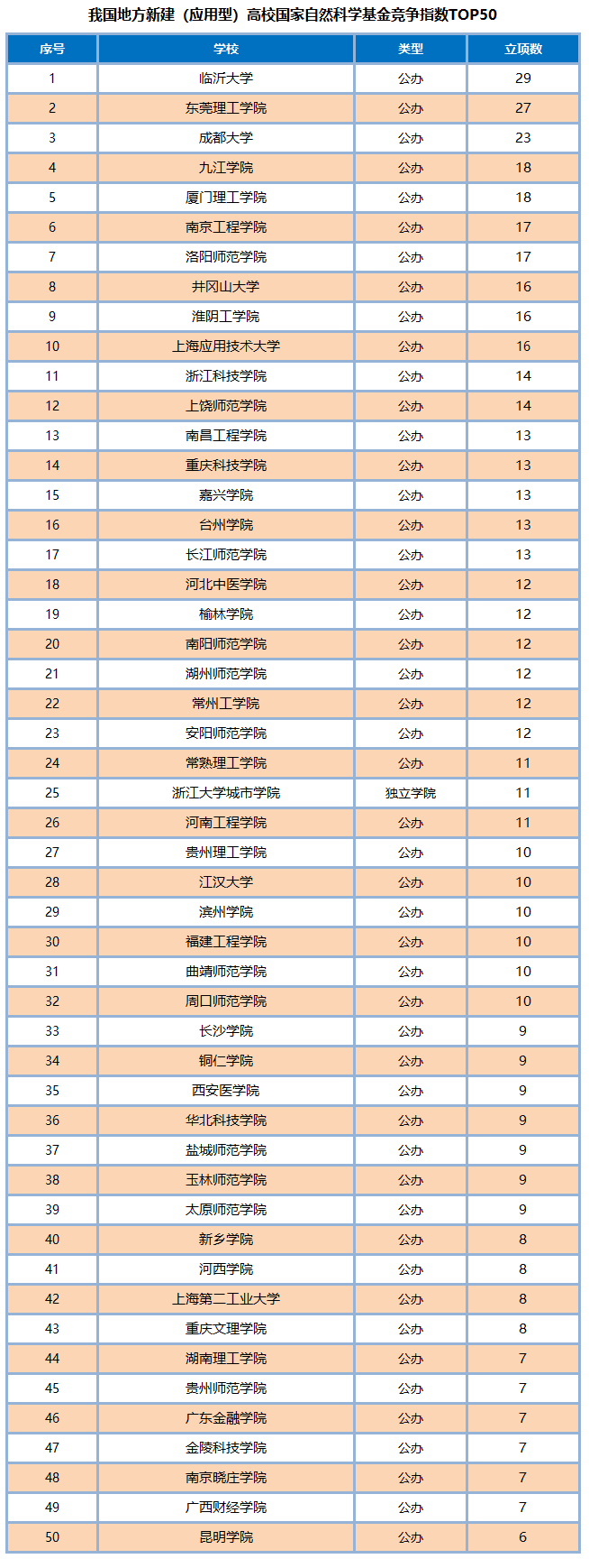 本网讯 “中国地方新建(应用型)本科高校综合竞争力排行课题组”(ICAUR)近日发布了“中国地方新建(应用型)本科高校国家自然科学基金竞争指数”。临沂大学、东莞理工学院、成都大学位居前三甲。