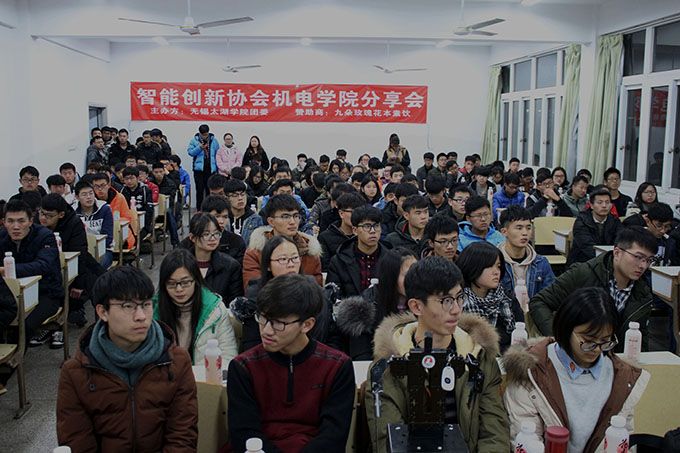 本网讯 12月19日晚6点,太湖学院智能创新协会在七号教学楼205教室举办了以“勇于追求,勇于创新”为主题的机械专业分享交流会。智能创新协会指导老师陈炎东、协会全体成员以及机电工程学院2017级全体学生参与了此次活动。