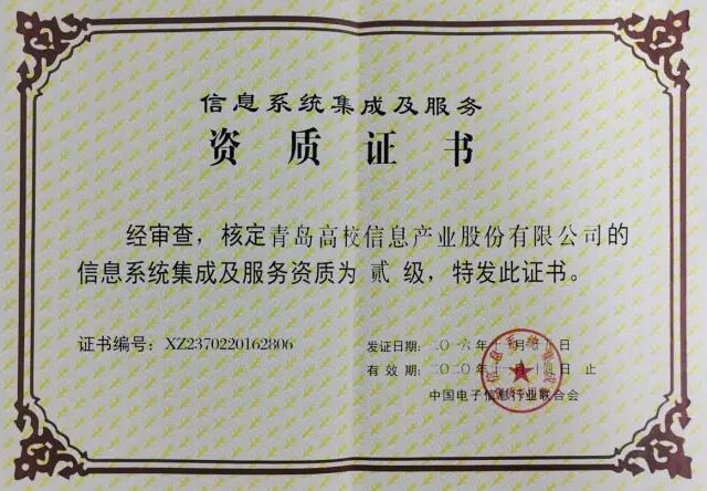 高校信息产业股份有限公司被授予“信息系统集成及服务二级资质”企业
