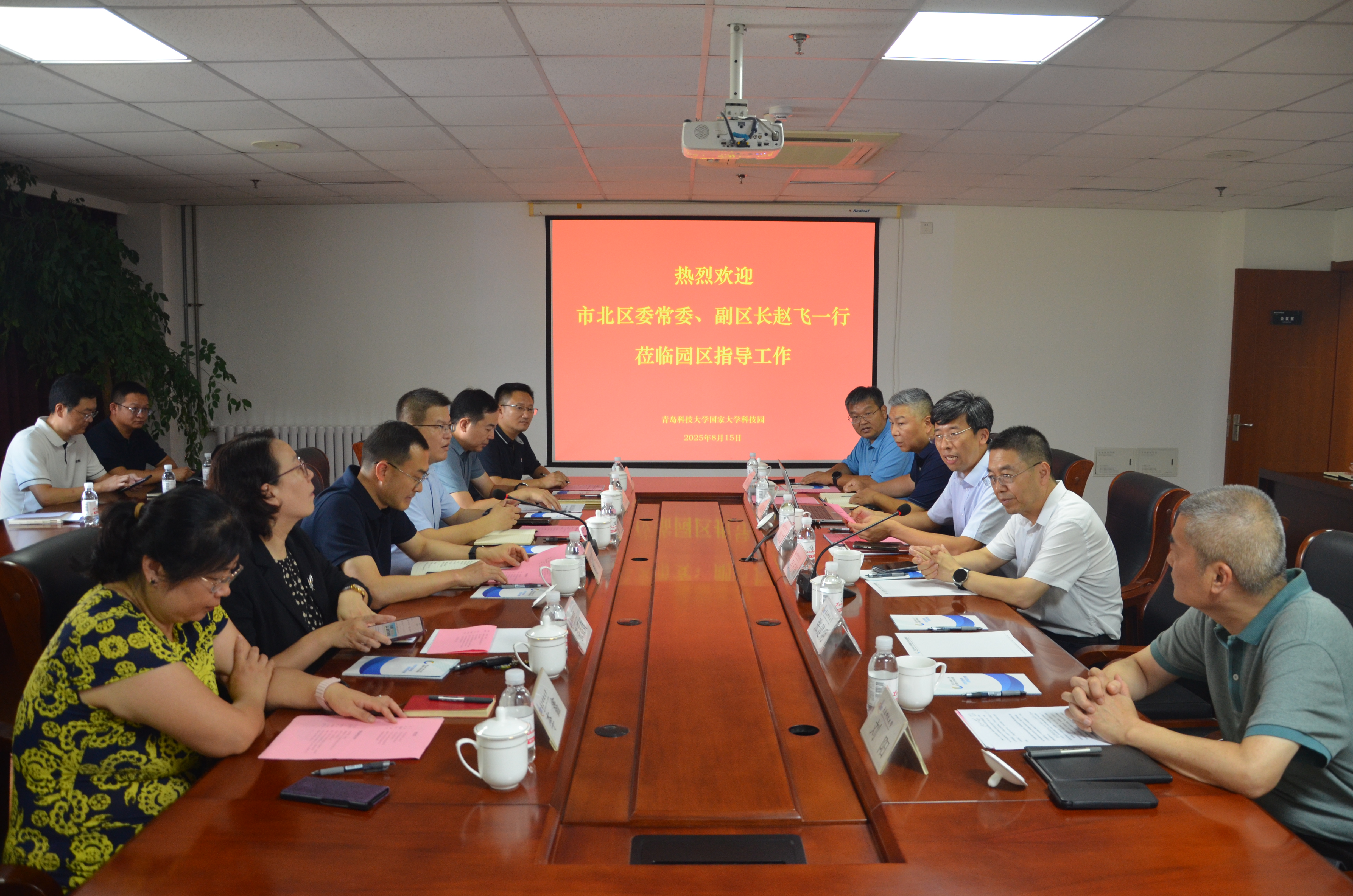 8月15日,市北区委常委、副区长赵飞率队来我校国家大学科技园调研交流政产学研融合发展工作,学校党委常委、副校长吕万翔陪同考察并出席座谈会。新葡萄8883官网AMG(国家大学科技园管理办公室)处长刘志国主持会议。