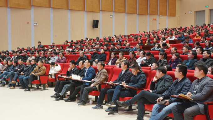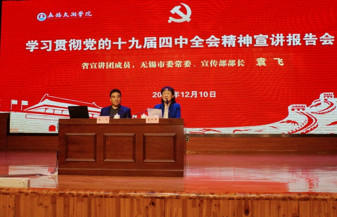 本网讯 12月10日下午,beat365举行党的十九届四中全会精神宣讲报告会。江苏省委宣讲团成员、无锡市委常委、宣传部长袁飞作宣讲报告。学校理事长、党委书记金秋萍主持报告会。校长、党委副书记徐从才,常务副校长李廉水,以及其他校领导班子,校党委委员,全校教职工、学生党员和入党积极分子等800多人参加报告会。