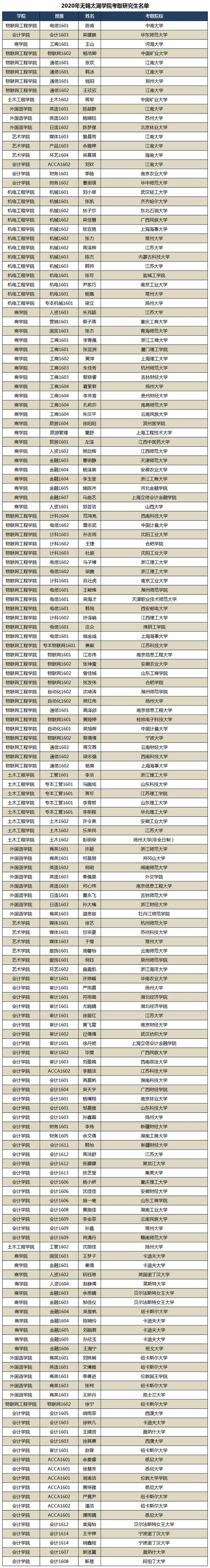 物联网工程学院2020届626名毕业生中,已有35名学生成功考上硕士研究生,考研录取率为5.59%,再创历史新高,被师生们称为“ 最牛考研学院”。会计学院审计1601班15名学生报名考研,8名学生考上理想院校,被称为“ 最牛考研班级”。 北宿三(1)-105宿舍六名男生四名考入理想院校 ,被称之为“最牛考研宿舍”。