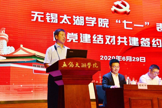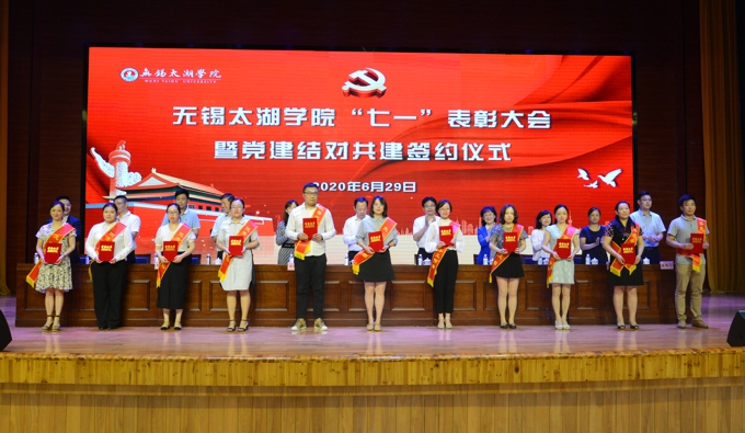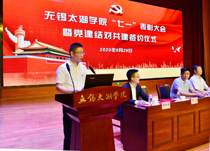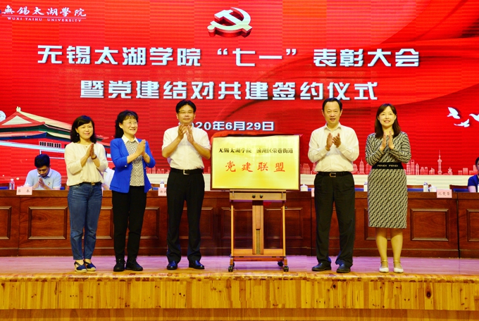 6月29日下午,beat365正版唯一官网举行“七一”表彰大会暨党建结对共建签约仪式。无锡市政协主席周敏炜出席并讲话。市委教育工委副书记符菊成、滨湖区副区长徐新宇,滨湖区荣巷街道新峰社区党委书记吕春、党委副书记王霞出席会议。学校党委书记金秋萍、校长李廉水,校领导丁涛、陈鹏飞、阙明坤,全体党委委员、全校教职工、毕业生党员代表参加会议。会议由校长助理、党委委员阙明坤主持。