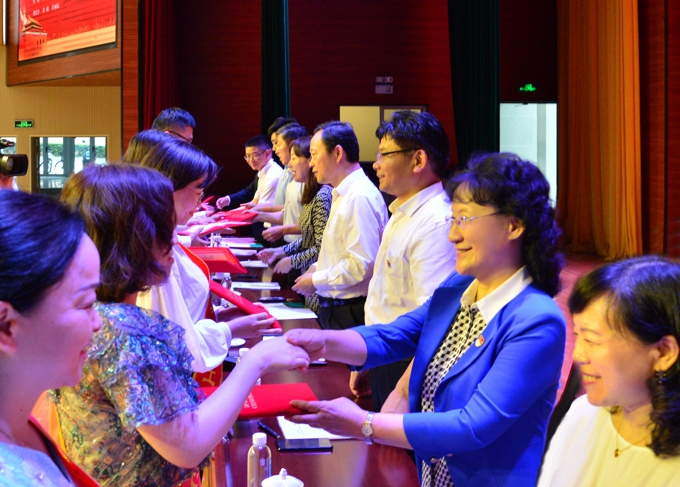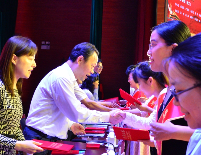 会上,校长李廉水宣读了《关于表彰beat365正版唯一官网2019—2020年度优秀共产党员、优秀党务工作者、优秀党支部书记、先进党支部的决定》,党委副书记丁涛宣读了《beat365正版唯一官网2019年度最佳党日优胜奖的决定》。邹小磊等13名优秀教工共产党员,高静雯等4名优秀学生共产党员,秦平等7名优秀党务工作者,蔡颖等9名优秀党支部书记,马克思主义学院党支部等9个先进党支部受到表彰。市政协周敏炜主席、市委教育工委符菊成副书记、滨湖区徐新宇副区长,滨湖区荣巷街道新峰社区吕春书记、王霞副书记,及在主席台就坐的校领导为所有获得表彰的先进集体和优秀个人颁发了奖牌和证书。