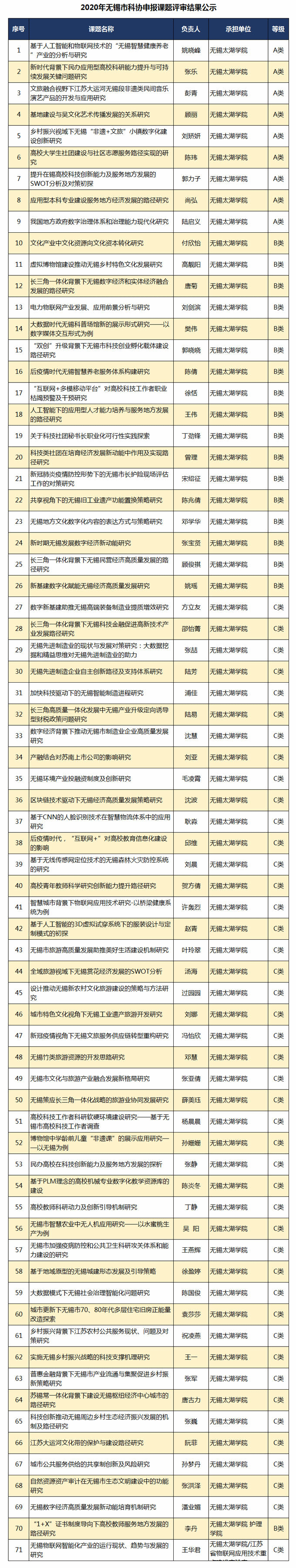 近日,无锡市科学技术协会发布了《2019-2020年无锡市科协软课题评审结果公示》,beat36527项课题获“市科协2019年结题课题”,71项课题获“市科协2020年重点课题”立项,至此,beat365在2020市社科与软科学课题立项数双双名列全市各单位之首。