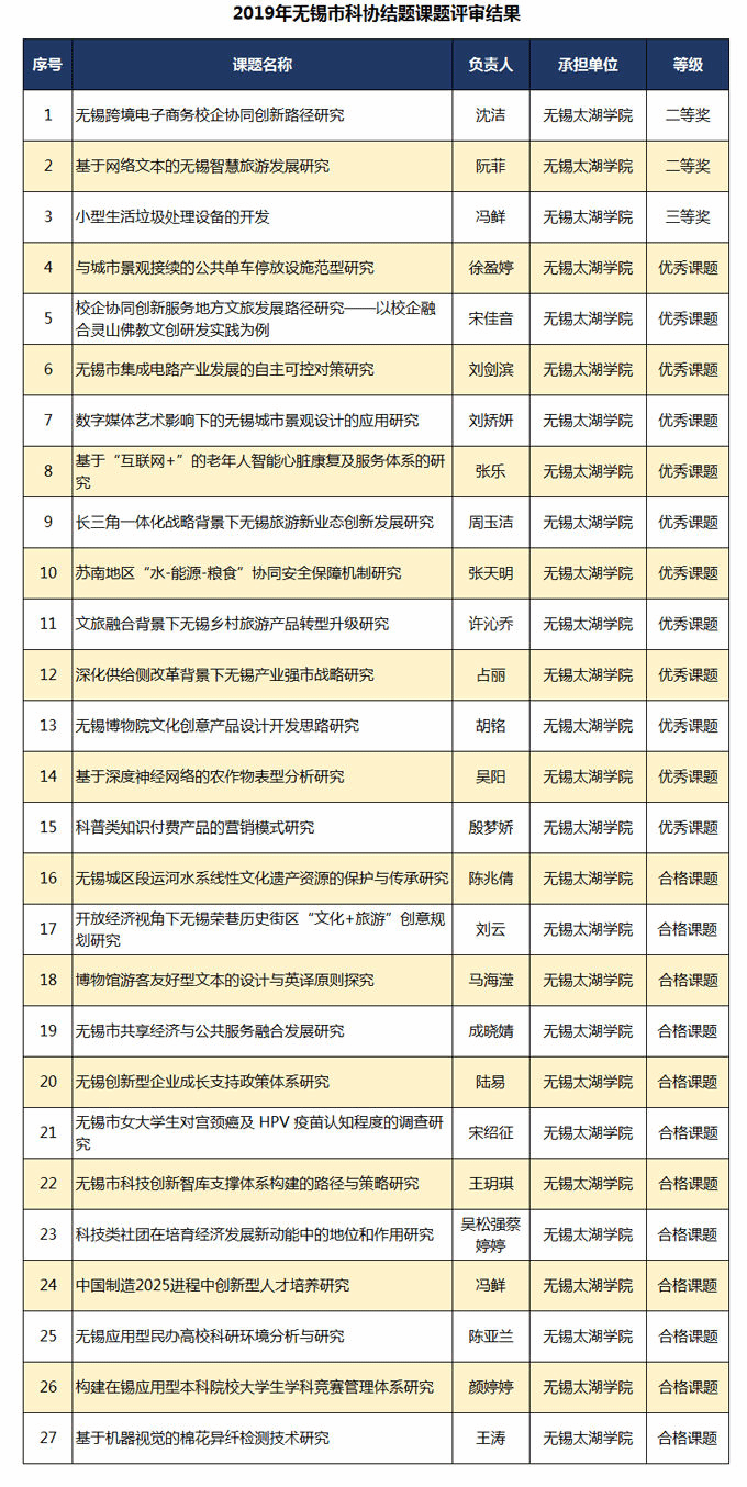 根据无锡市科协软课题评审结果公示,2019年无锡市科协共有152项结题课题,75个项目被评为优秀课题,beat365沈洁《无锡跨境电子商务校企协同创新路径研究》、阮菲《基于网络文本的无锡智慧旅游发展研究》等15项课题获“市科协2019年结题课题” 优秀课题。2020年无锡市科协立项300个重点课题,其中资助课题100个,beat365姚晓峰《基于人工智能和物联网技术的“无锡智慧健康养老”产业的分析与研究》、张乐《新时代背景下民办应用型高校科研能力提升与可持续发展关键问题研究》等27项课题获市科协资助课题立项。