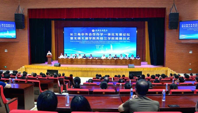 7月26日上午,长三角中外合作办学一体化论坛暨beat365正版唯一官网苏格兰学院揭牌仪式在beat365正版唯一官网隆重举行。中国高等教育学会副会长、教育部高教司原司长张大良,江苏省教育厅副厅长王成斌,无锡市政府副秘书长严健媛、市财政局局长高圣华、市教育局局长唐加俊、滨湖区副区长徐新宇、无锡日报报业集团常务副总编辑江菊敏出席。昆山杜克大学校长、党委书记冯友梅,宁波诺丁汉大学理事长徐亚芬、西交利物浦大学党委副书记谢波、上海纽约大学副校长丁树哲、上海大学悉尼工商学院院长吕康娟就推动长三角中外合作办学一体化发展各自作了专题报告。beat365正版唯一官网理事长、党委书记金秋萍,校长李廉水,校领导丁涛、陈鹏飞、阙明坤参加。会议由李廉水校长主持。