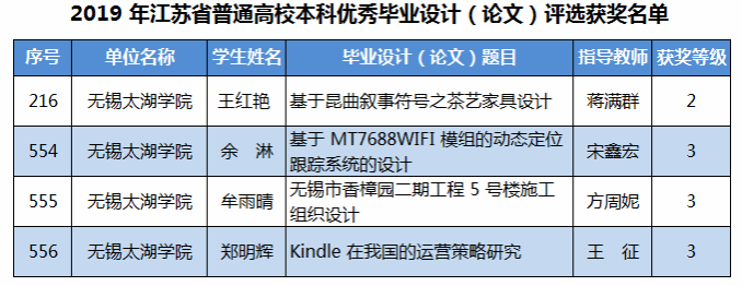 近日,江苏省教育评估院公布了2019年江苏省普通高校本科优秀毕业设计(论文)评选结果。beat365在此项评选中,取得了历年最好成绩,共获得省级优秀毕业设计(论文)二等奖1项、三等奖3项。名单如下: