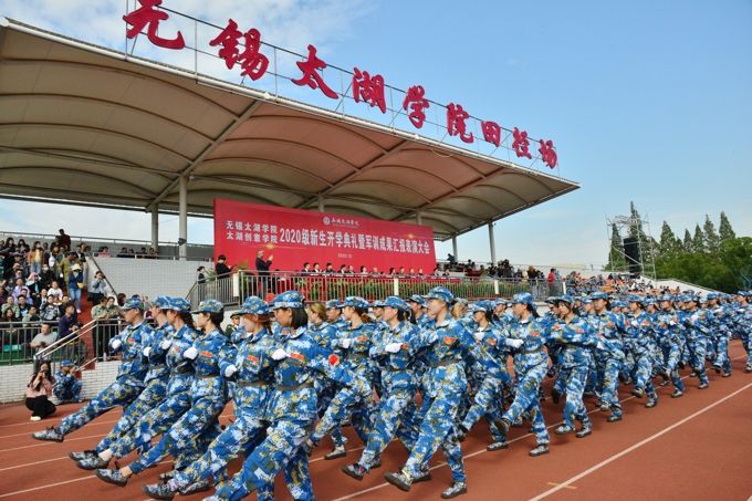 会上,来自全国28个省、市、自治区的5000多名新生以饱满的精神、昂扬的风貌汇报了半个月的军训内容。在奏唱国歌后,伴随激昂的《中国人民解放军进行曲》,副校长陈鹏飞检阅了受训队伍。各受训方阵依次通过主席台,同学们步履铿锵、目光坚定、身姿挺拔,展现了太湖学子的自信与风采!随后,受训新生进行了分列式、军体操、长棍术等表演,展示了军训取得的丰硕成果。